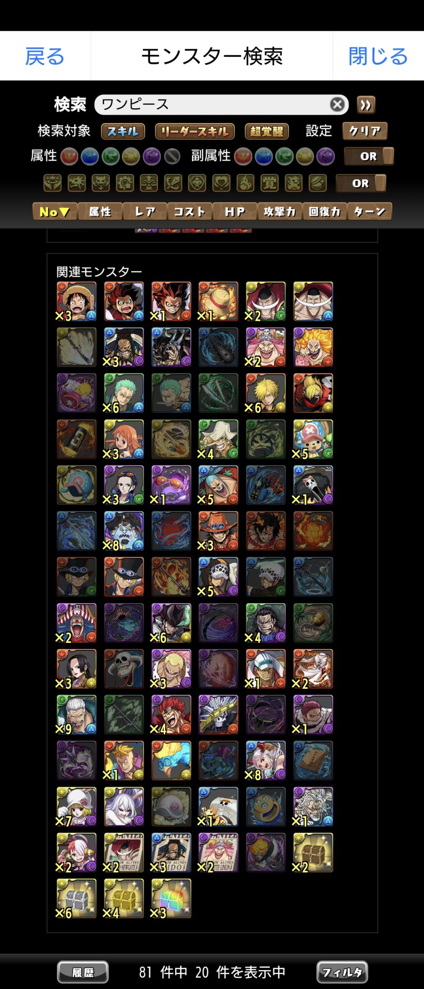 その他→モンスター検索→ワンピースで検索→適当に関連キャラタップして下の方