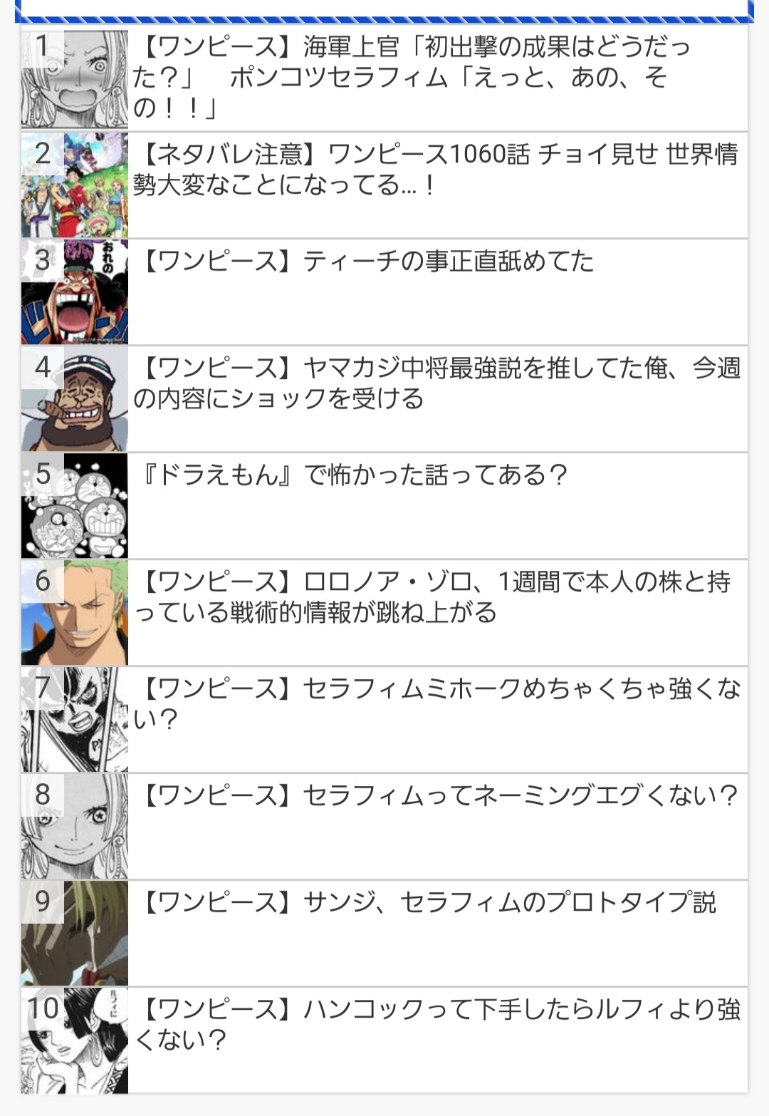 本家のまとめ記事、七月くらいからワンピか荒れ記事しかコメント100超えてないんだよな