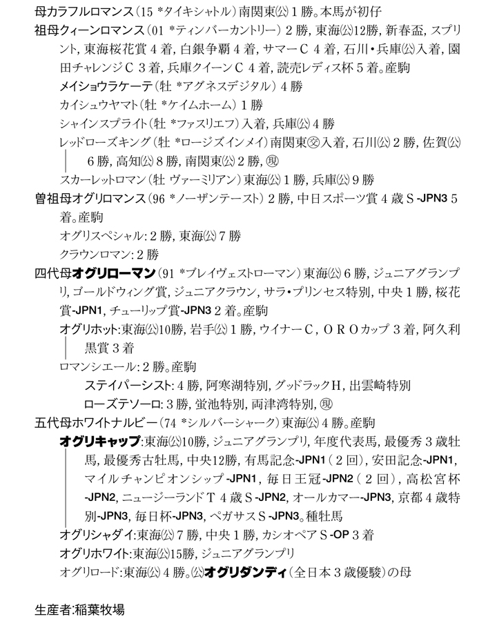 桜花賞馬オグリローマンを経て繋がる牝系は稲葉牧場が代々繋げてきた牧場自慢の血統だ。