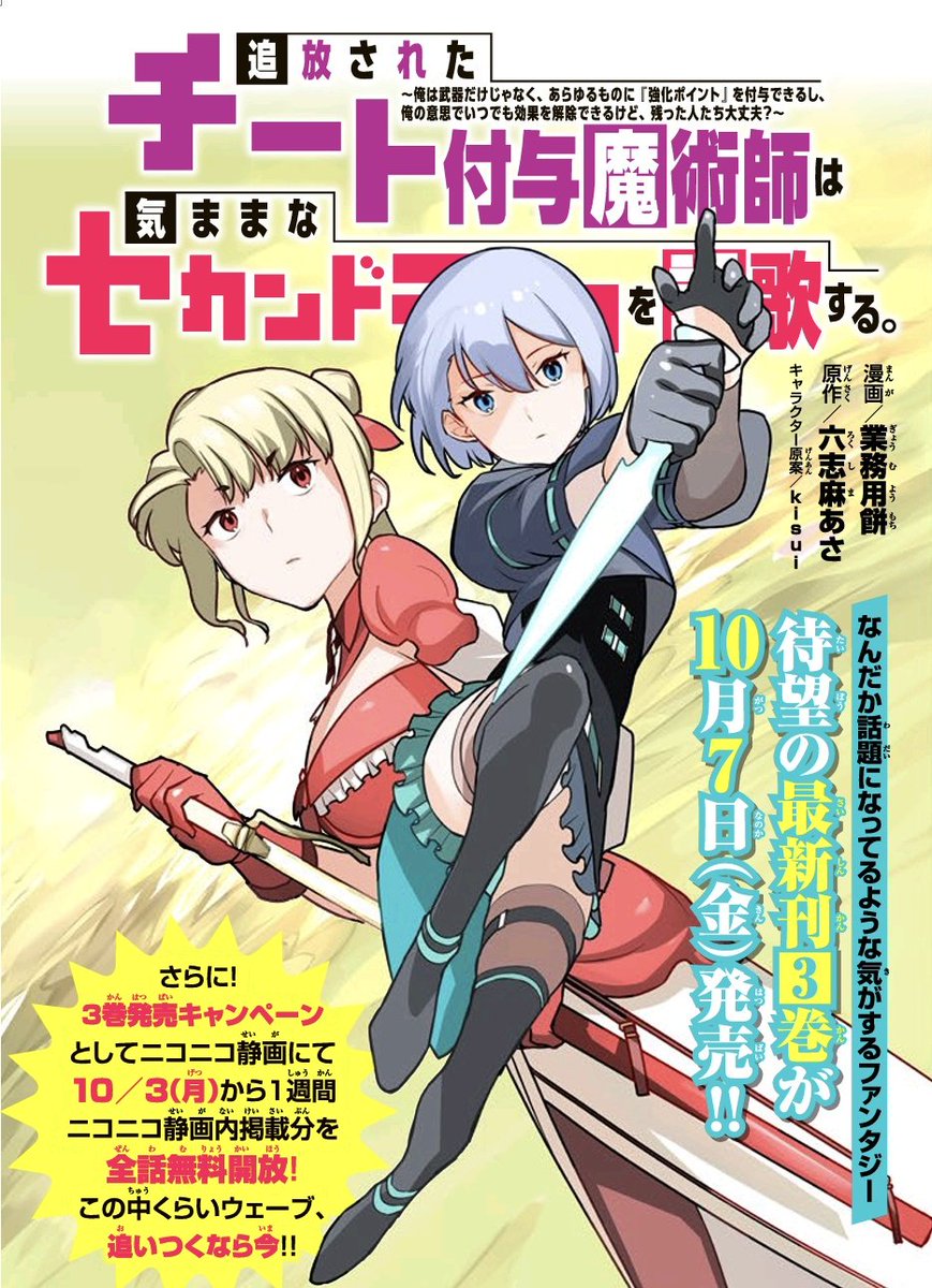 #ニコニコ漫画追放されたチート付与魔術師は 気ままなセカンドライフを謳歌する。 / 六志麻あさ 業務用餅 kisui最新話:第9-①話 2022/07/25更新。再生(累計): 962647。 全話無料。 ずっとギルドで装備の強化!気づけば無用の烙印押され…