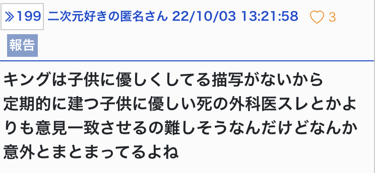 - 42二次元好きの匿名さん22/10/03(月) 14:40:31現パロだと元気に親バカやってるキング好き