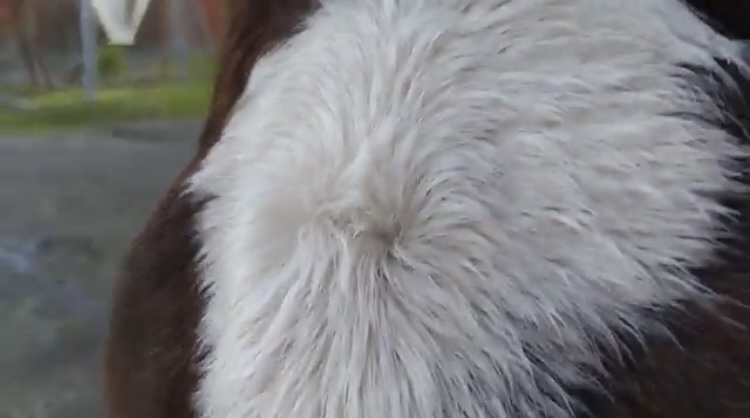 昨日の夕方、脚のケア中のドットさん🐴視線の先には鹿🦌たちがおります😌