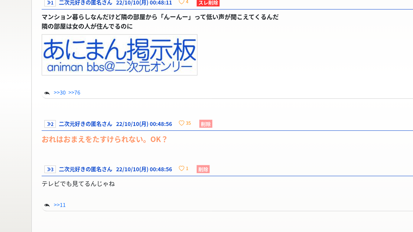 - 11◆H7Ujb3ZwK222/10/10(月) 23:23:04こわいこわいたすけてくれ|あにまん掲示板マンション暮らしなんだけど隣の部屋から「んーんー」って低い声が聞こえてくるんだ隣の部屋は女の人が住んでるのにbbs.animanch.com