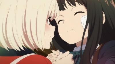 センター試験をがんばった千束におでこにキスしてくれるたきな先生……