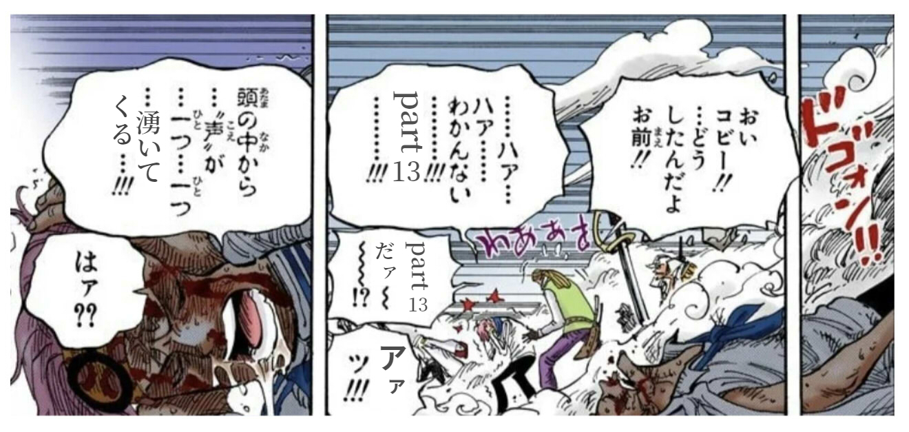 √分岐のせいかコビーの概念多いな…、マキマさんっぽい海賊を椅子にしてるコビーは洗脳コビーかな?古代兵器覚醒コビーかな?BADENDはまた別だし、人格分裂コビーは双子ちゃん扱いで