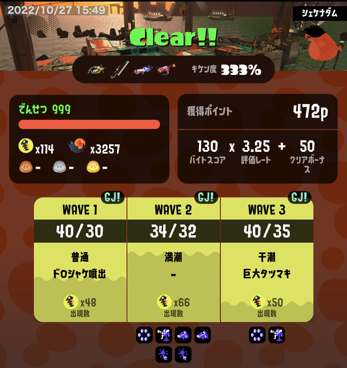 28秒付近で湧いたテッキュウは無理に倒しに行こうとせずジャンプでかわしてカゴ付近の納品を進めた方が成功率高い