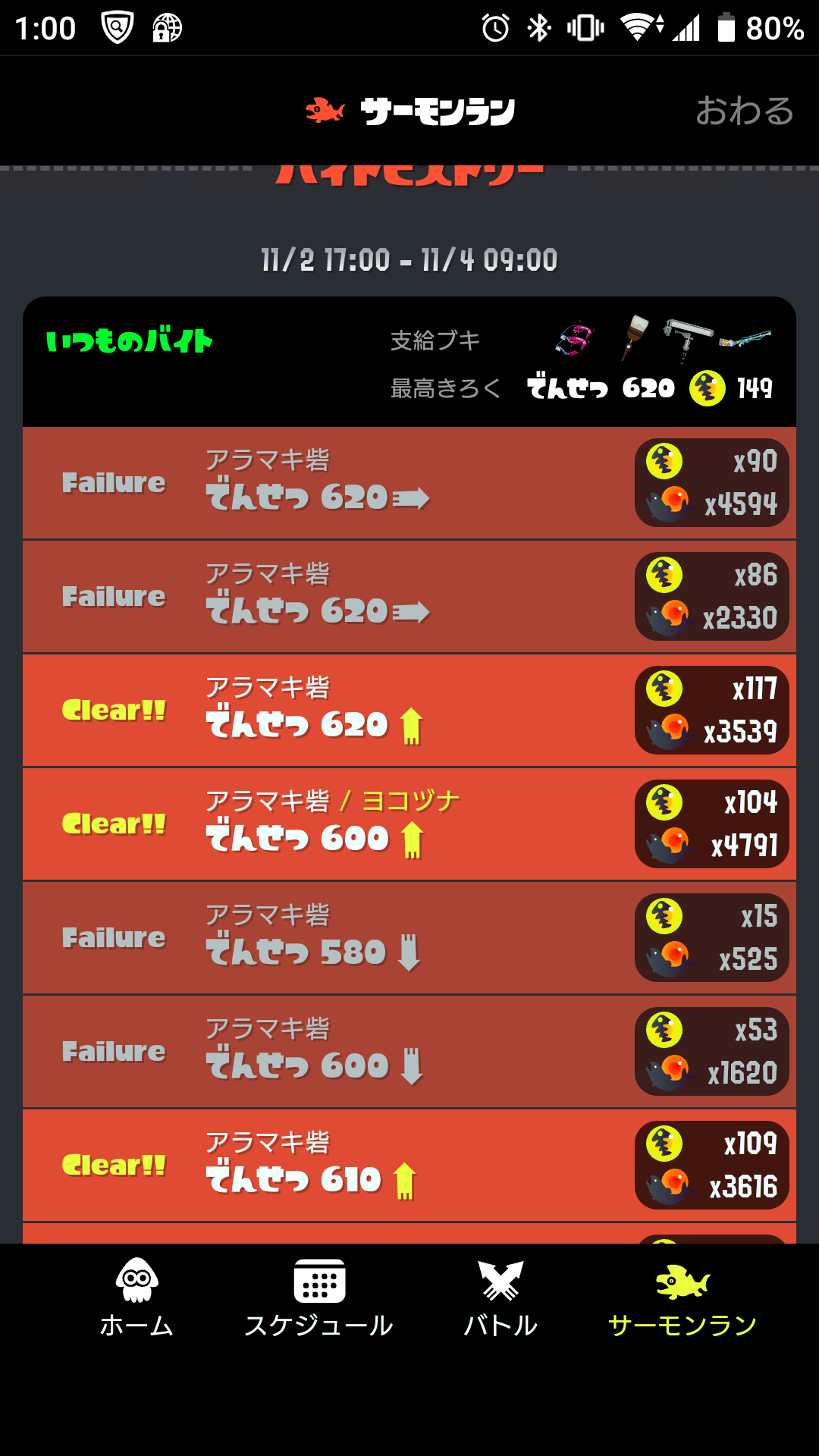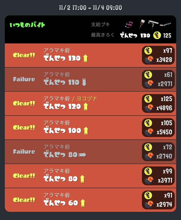 うまい人ほど勝率がかわる武器1バクダン、ハシラなどのオオモノを倒したり、雑魚処理などのサポートを基本にするが満潮の場合はステの都合上今回はとくに、出現した時点で処理したほうがいい、イクラはある程度納品したほうがいいが遠出で絶対しないほうがいい