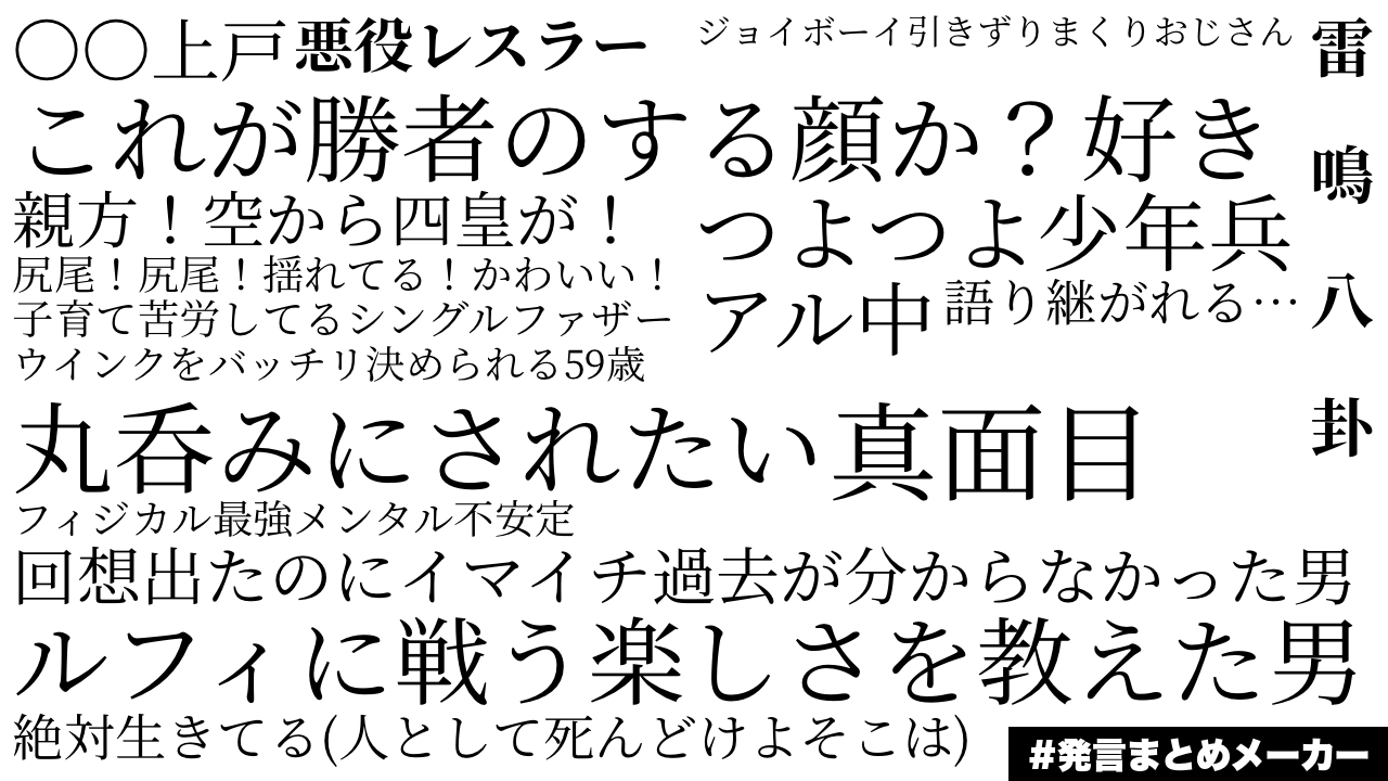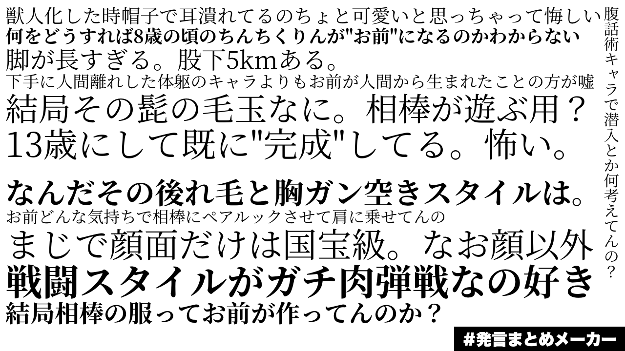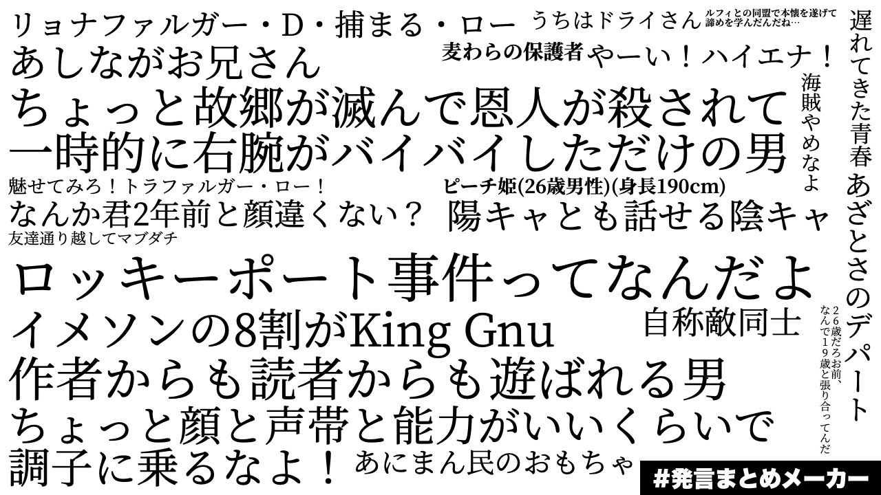 - 1二次元好きの匿名さん22/11/07(月) 12:17:05みんなの発言をまとめよう!こういう感じの画像が簡単につくれます!hatsugen-matome-maker.yukihiro.work