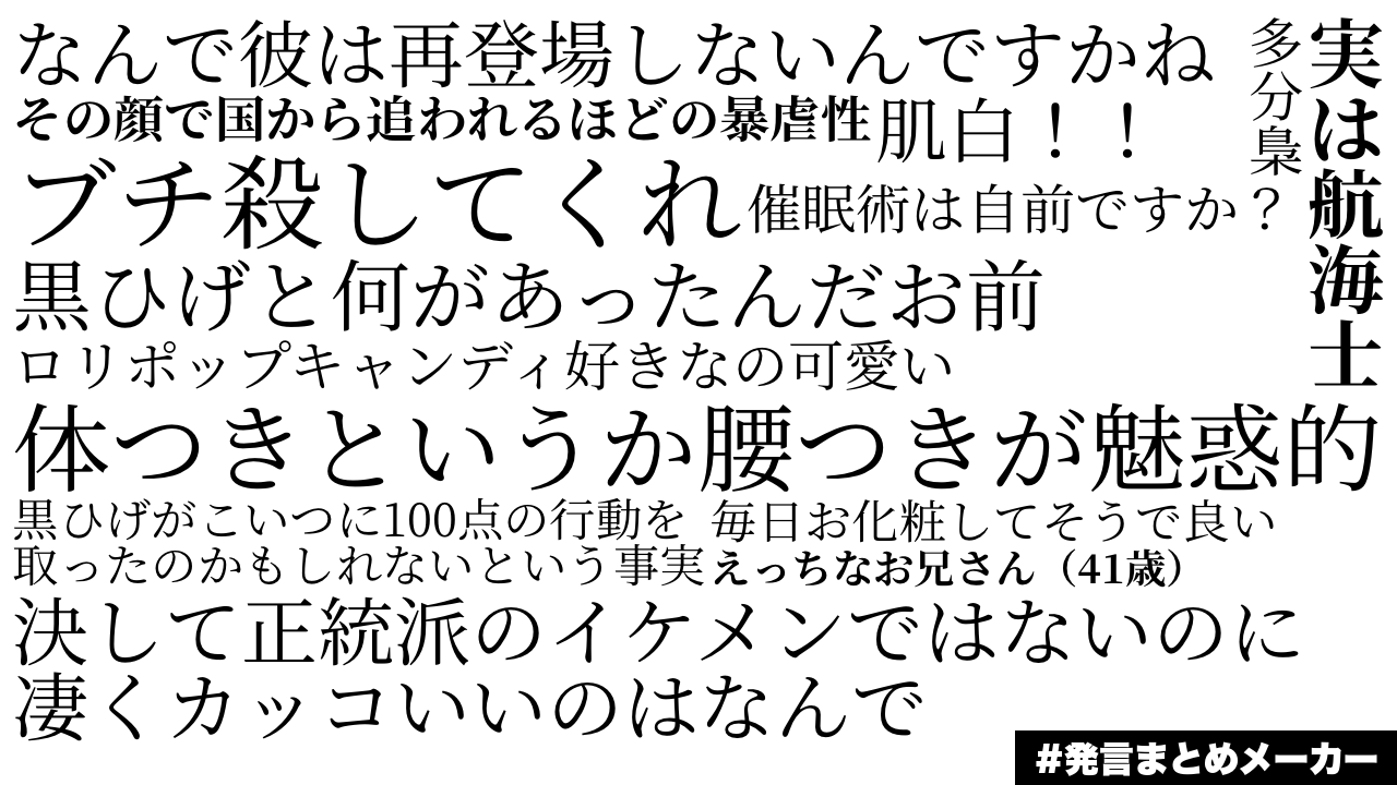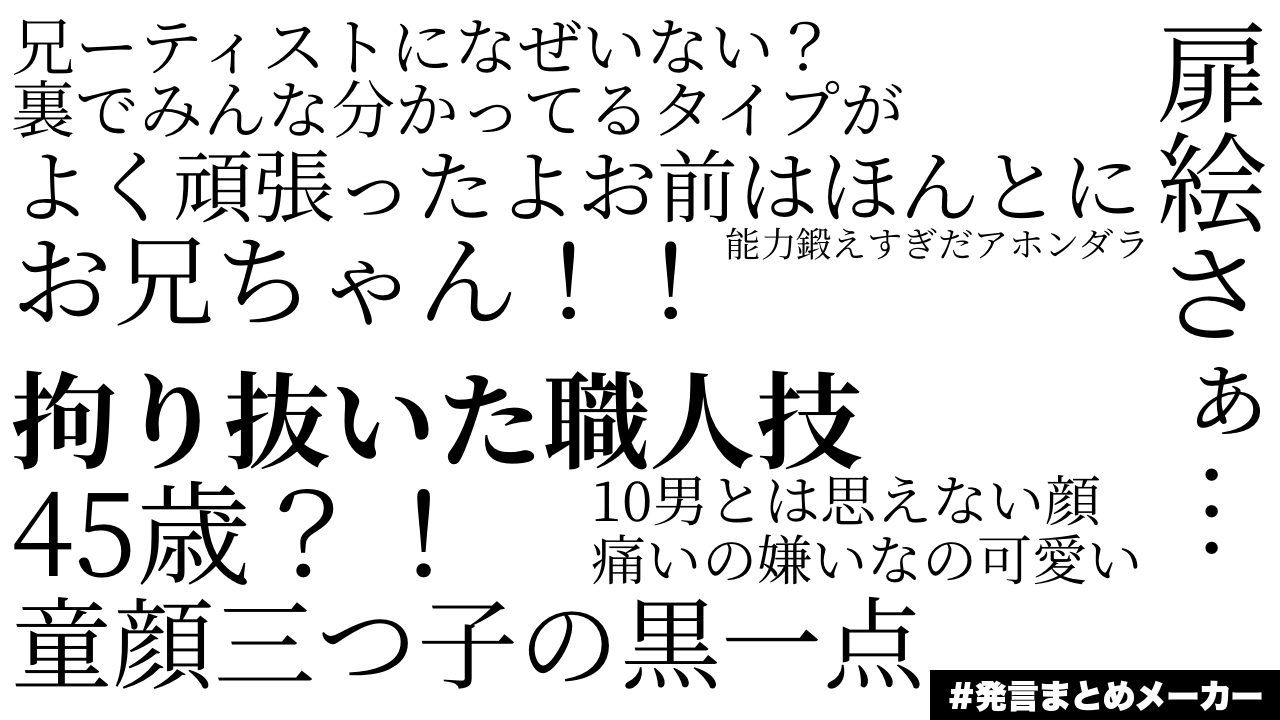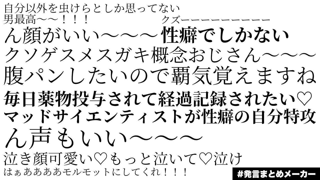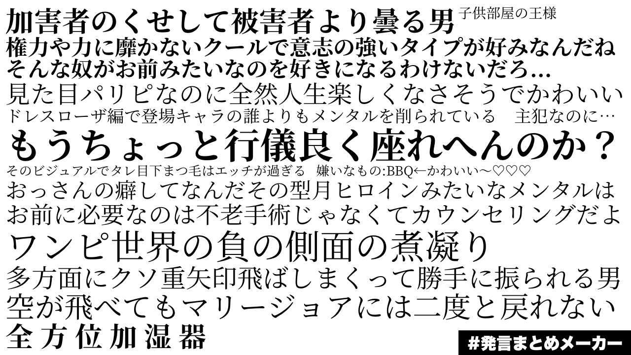 - 1二次元好きの匿名さん22/11/07(月) 12:17:05みんなの発言をまとめよう!こういう感じの画像が簡単につくれます!hatsugen-matome-maker.yukihiro.work