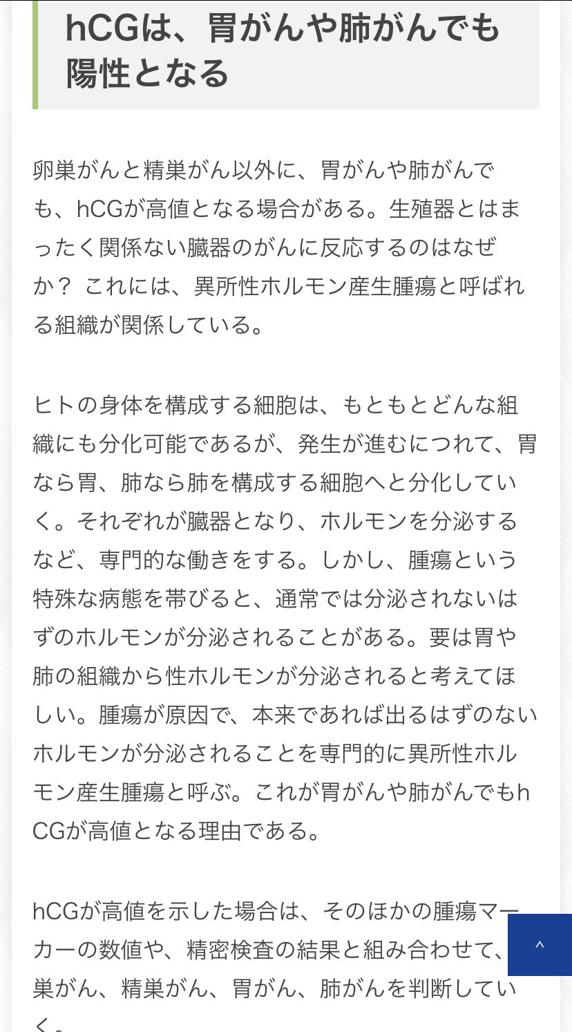 頻度が1万人に1人程度の疾患な上好発年齢が20代後半〜30代前半 hCG産生性の病型も限られるため兄弟とかならともかくモブの親世代には実用性が低いと思われるが…