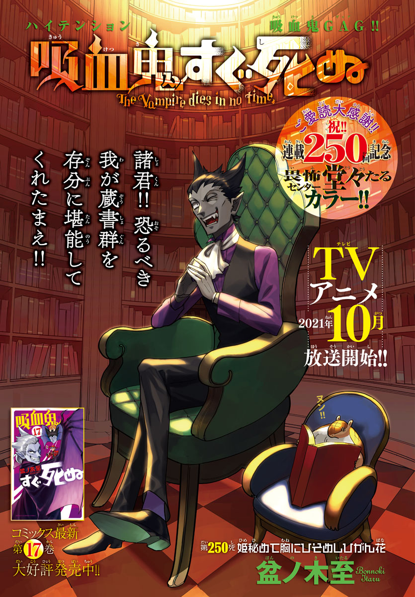 【<a href="https://twitter.com/hashtag/吸血鬼すぐ死ぬ" target="_blank">#吸血鬼すぐ死ぬ</a>】祝🎉連載250回記念畏怖堂々たるセンターカラー!明日木曜日(6/10)発売「<a href="https://twitter.com/hashtag/週チャン" target="_blank">#週チャン</a>」28号に250死「姫秘めて胸にひそめしひがん花」掲載です!ロナルドの事務所を訪れた吸血鬼に恋する依頼人・ヒバナちゃん!?【<a href="https://twitter.com/hashtag/盆ノ木至" target="_blank">#盆ノ木至</a>】