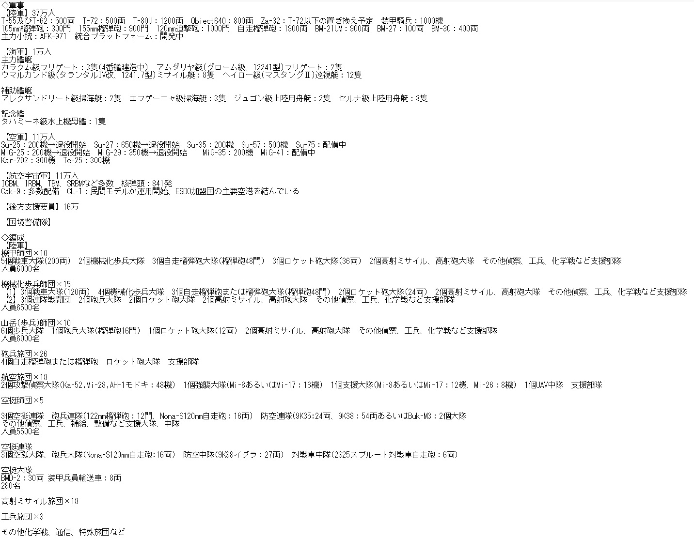 海外への兵器輸出事業も好調である。例えば、UMIは3月にパカンダ諸王国連合軍が運用するTe-25戦闘機用兵装に関する新たな契約を締結している。10月にはミスル共和国軍とMiG-27の整備に関する契約を行った。こうした兵器輸出もESDO諸国を中心に拡大していく方針のようだ。