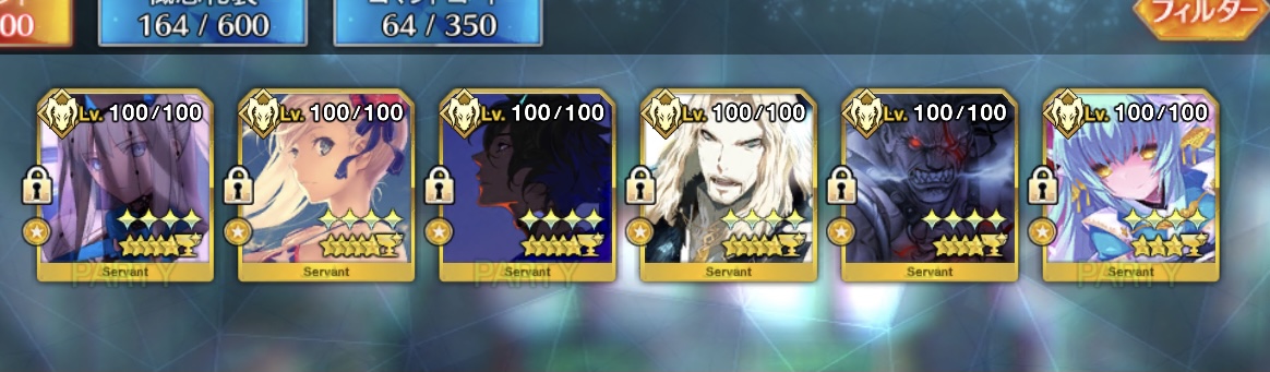 3章で落ちたアステリオスとエウリュアレ、後は6章後に円卓を金で揃えたかったベディ。羽海野先生が好きなのでオベロンは速攻で育てて聖杯あげちゃった