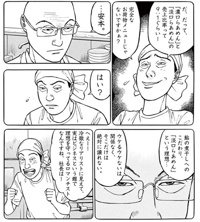 不渡り出しそうなときに鮎から他のものに変えるアドバイスして、プライドでそれは嫌だって言われた人間が、客に目がくらんで風味が完全に死んだラーメン出すなんて考えつかないよね……