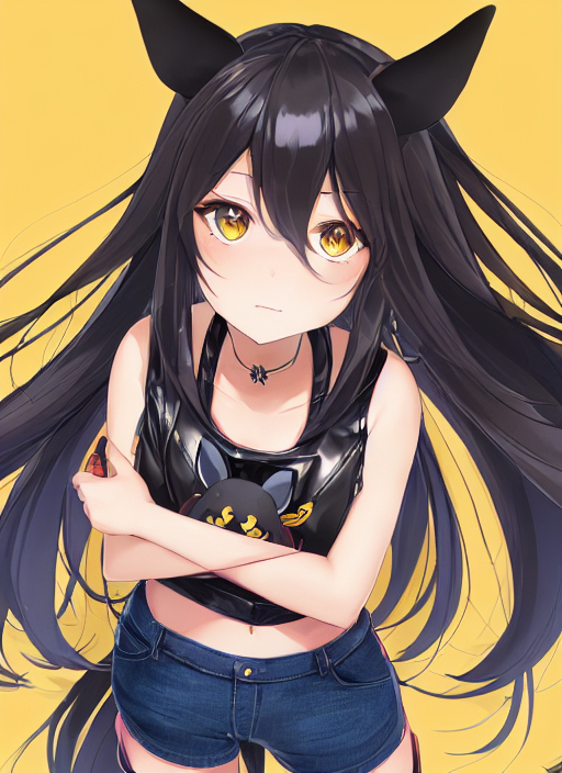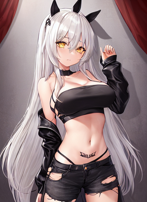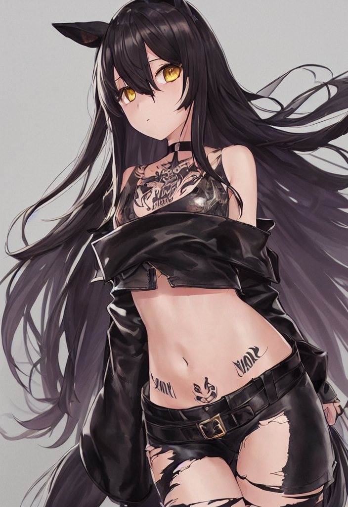 1girl, portrait, breast curtains, huge breasts, large breasts, small tattoo, crop top overhang, {{revealing clothes}}, {{black long hair}}, {{{{horse ears}}}}, {{very long bang}}, {{hair between eyes}}, {yellow eyes}, torn tube top, torn bear top,