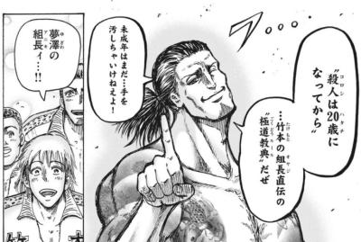 悪さすると忍者が現れる 忍者を誘き出す為ににわざと悪さするがその悪さが敵対する極道や半グレ100人の首もぎ取って竹下通りに並べようって流れ ここでポイントなのがあくまで殺すのは極道や半グレでカタギには手を出さず20歳以下の組員には20歳になるまで殺しはさせないルールで殺しをさせなかった事 これだけで夢澤の兄貴が作中の極道の中で聖人といわれる所以