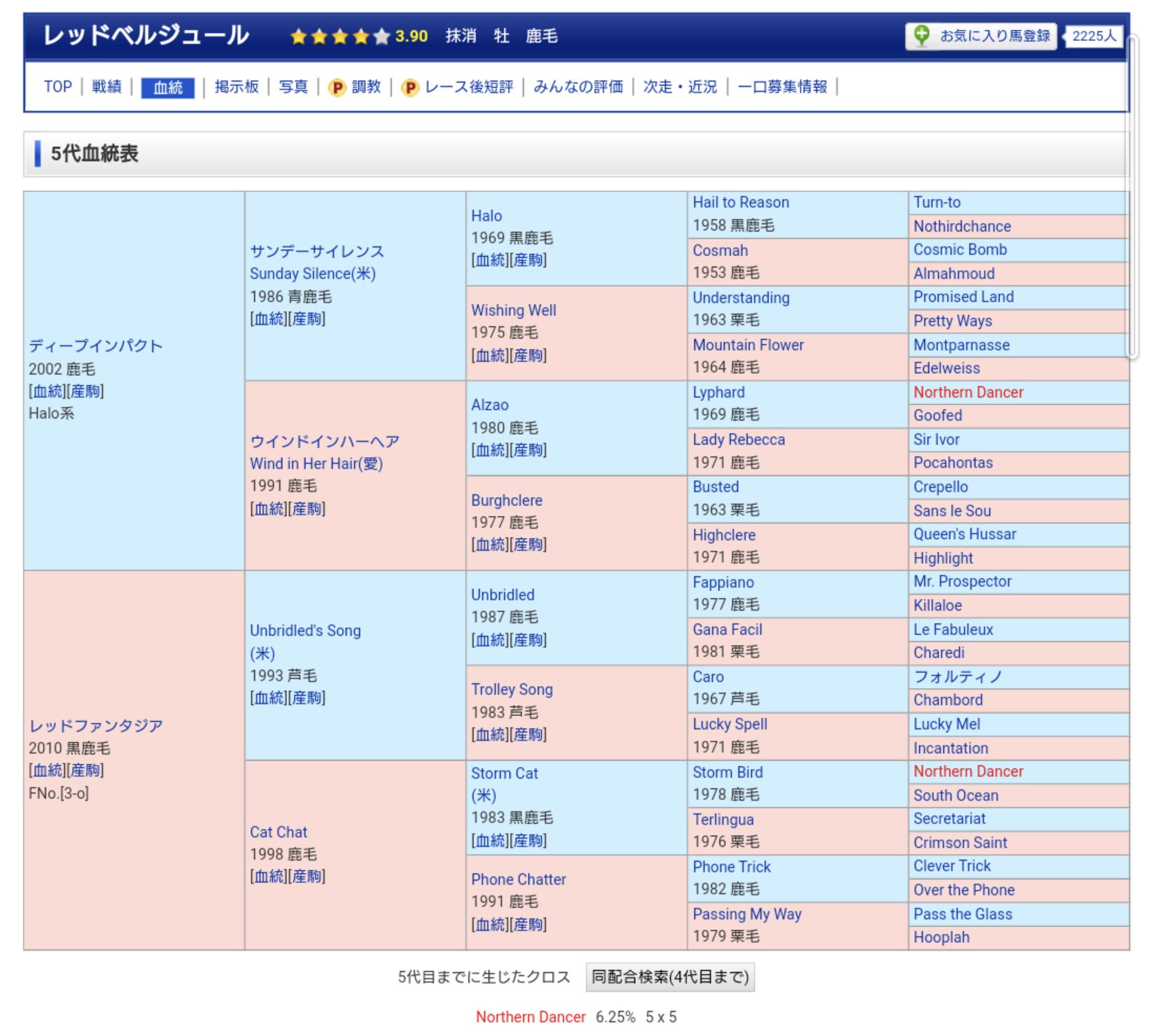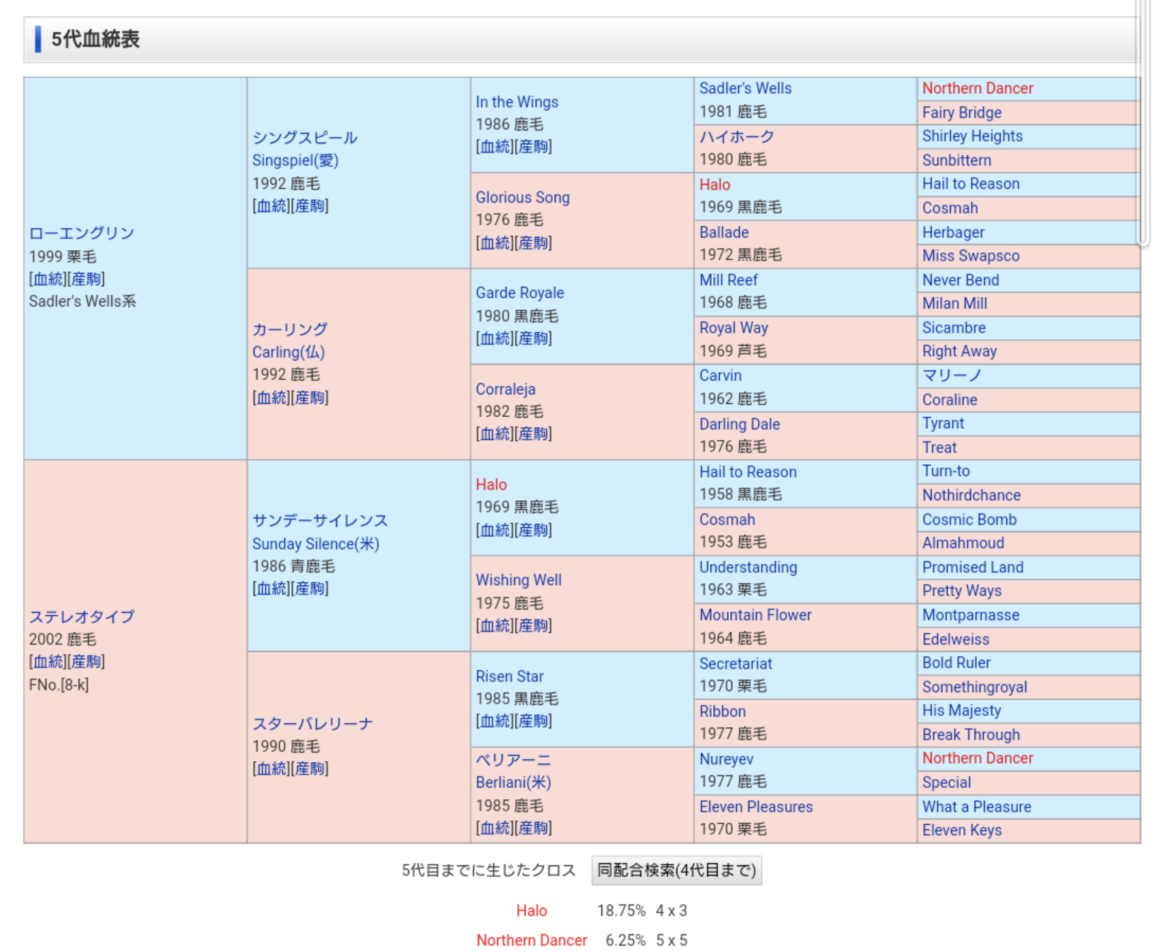 この5代血統表にクロスは無いように見えるが実は右端のサーゲイロードがターントゥの子であり、ロイヤルチャージャー系に属するのでそこにターントゥのクロスが発生している