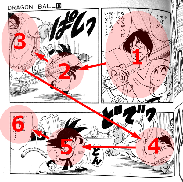 ぱっとみて、まず悟空の顔から拳に視点が移って、その移動の間にベジータの顔がチラッとみえる。そして殴り付けた拳の直線上を次のコマで悟空が移動して、悟空がベジータの下に移動するコマはコマ移動で自然と下がったままで認識できる。