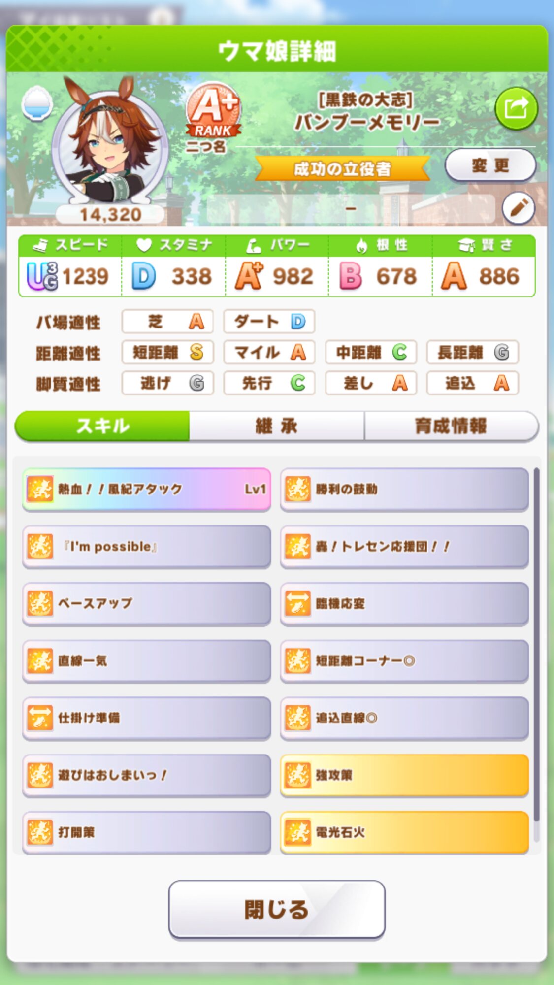 強い。短距離継承2回必要。問題点はゼファーと欲しいポジションが完全に被る事。利点は幸運な先行を取った場合非常に強い事