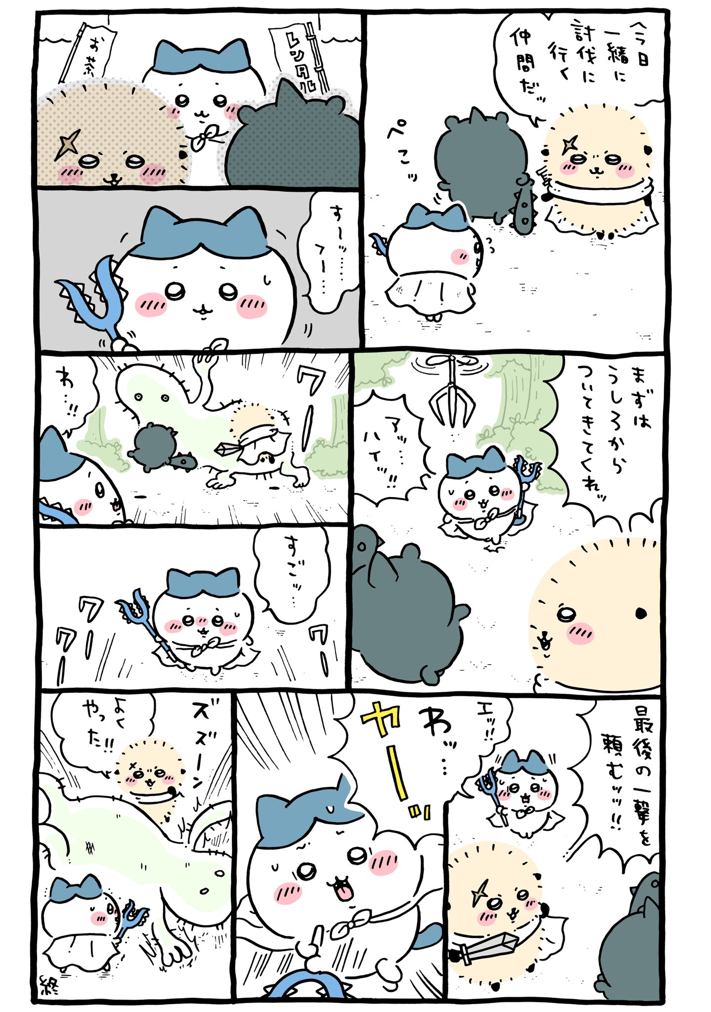 ちいかわ側は一発KILLが当然の世界なので初めからトドメだけ任されるハチワレがずるいとも思っていない