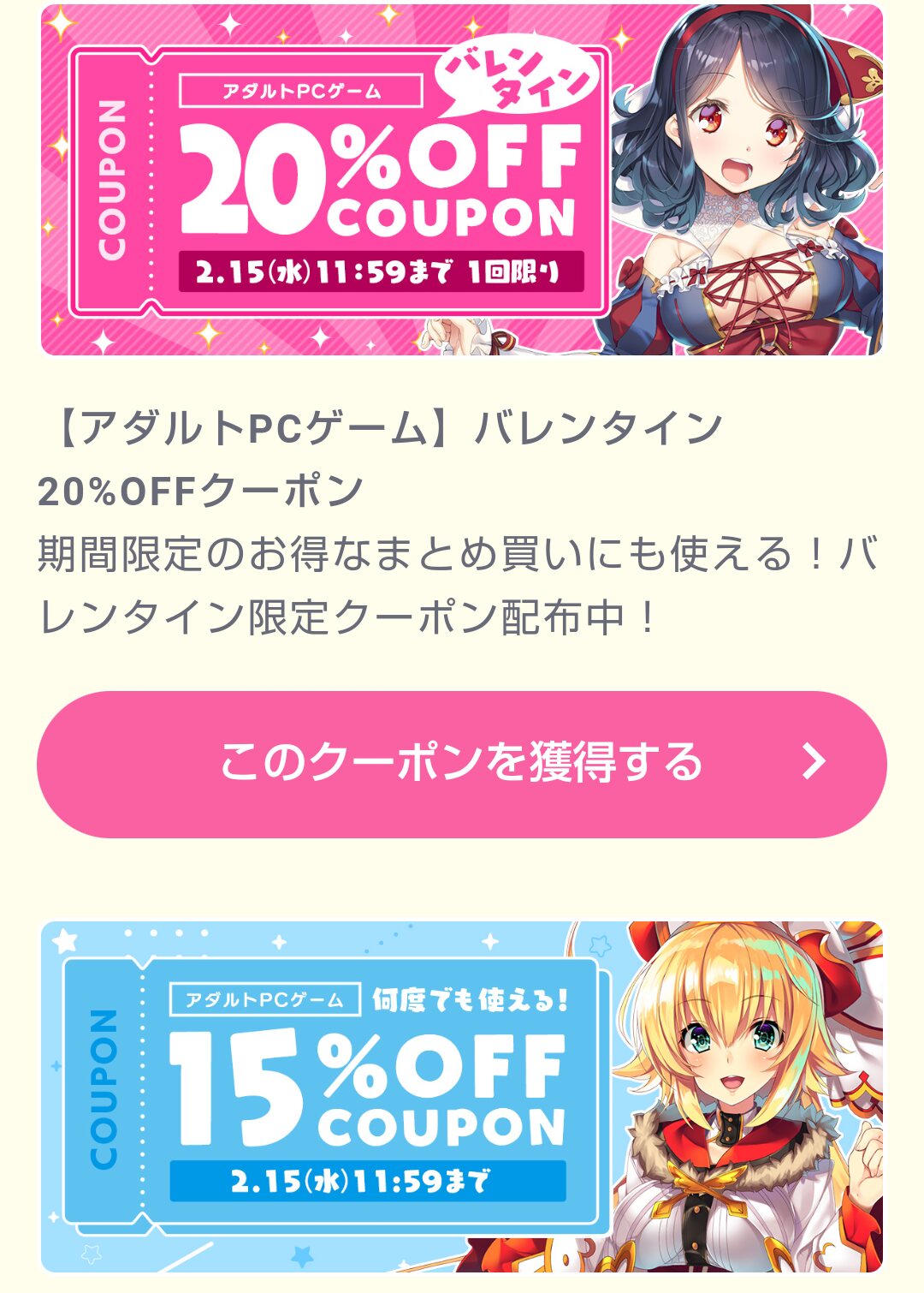 FANZAに20と15%オフクーポンきたね