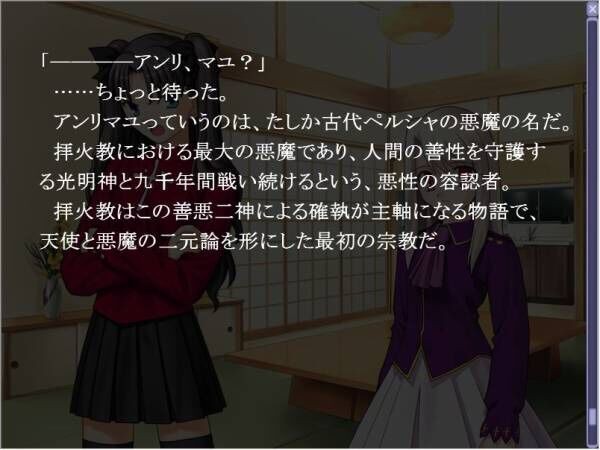 ……ちょっと待った。アンリマユっていうのは、たしか古代ペルシャの悪魔の名だ。拝火教における最大の悪魔であり、人間の善性を守護する光明神と九千年間戦い続けるという、悪性の容認者。拝火教はこの善悪二神による確執が主軸になる物語で、天使と悪魔の二元論を形にした最初の宗教だ。