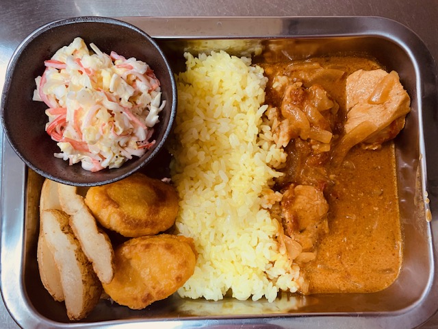 補給の合間で食いモンが少なくなってきたんで、アラバスタで買い込んだ香辛料とバナナワニの肉をココナッツで煮込んだカレーに、こないだ知り合いからたんまり届いた芋を揚げて添えてみた