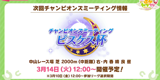 ・サポート編成はキタサン/賢ユキノ(1凸)/ダスカ(レンタル枠)/SRスピエルまで確定で残りをファイン/ハロー/ラモーヌ(1凸くらいの予定)で迷ってる