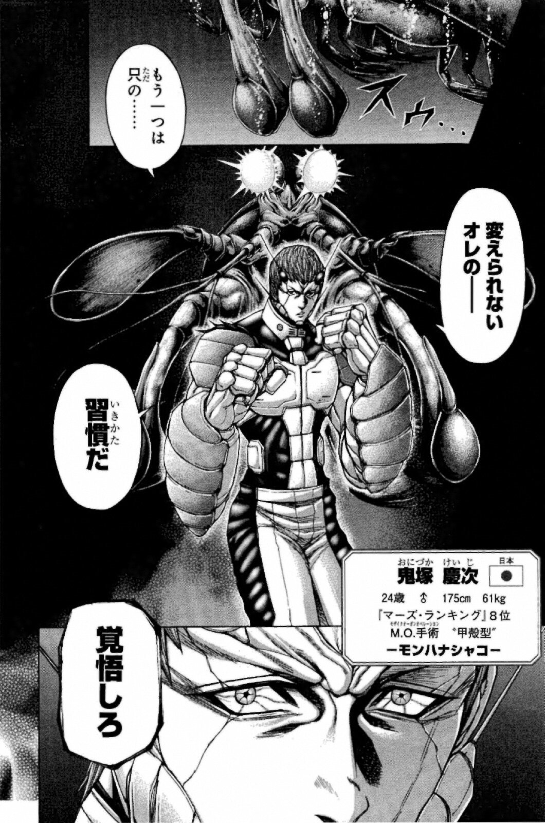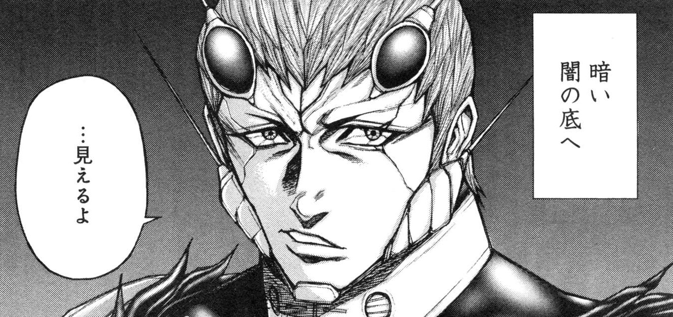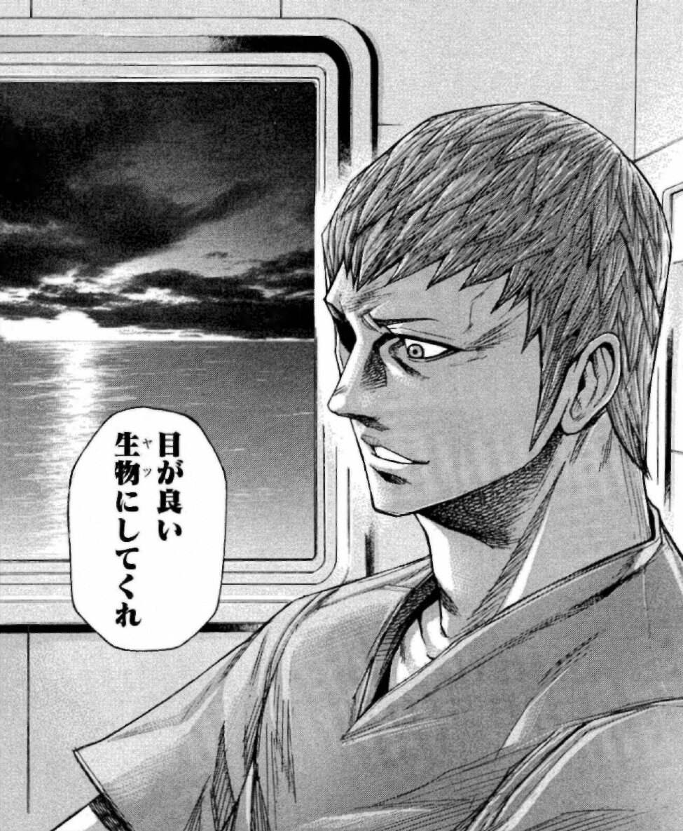 絵柄と台詞的にテラフォーマーズ? 主人公側の実力者だが自信家で俺様系。 一度敗北して片目の視力を失うが性格は丸くなる。