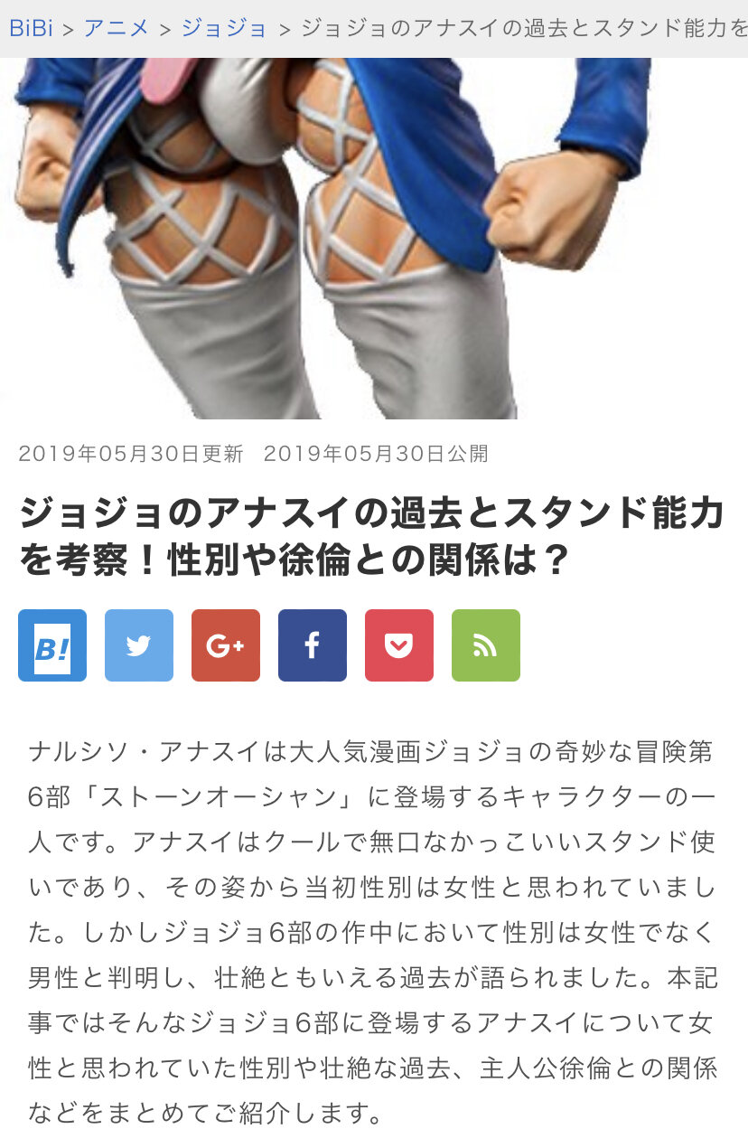 コスプレで絶対着なければいけないとして五部のやつらはボスを除いてそんなにきつくないがアナスイはやべぇ - 58二次元好きの匿名さん23/03/11(土) 13:59:16