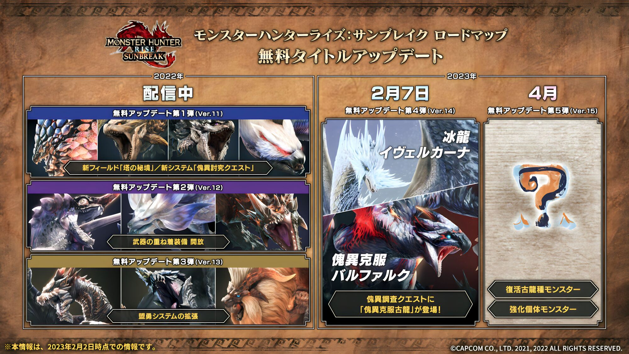 禁忌の古龍達(ミラルーツ、ミラボレアス、ミラバルカン、ミララース、アルバトリオン、グラン・ミラオス)、アルトゥーラ、ムフェト・ジーヴァ、ダラ・アマデュラ、ラヴィエンテ