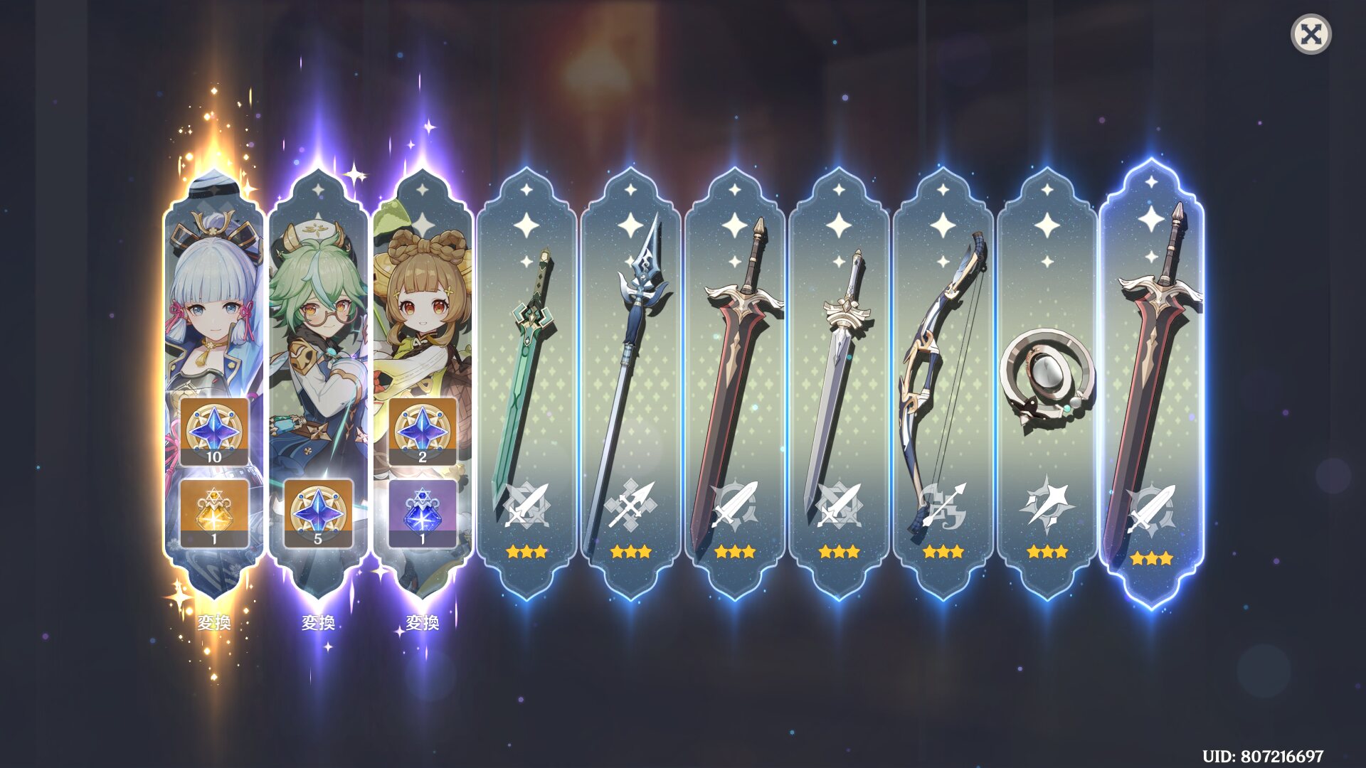 恐らく前半が星5白朮と星4カーヴェとミカのイベントガチャ1と復刻ガチャでイベントガチャ2…周期的にナヒーダが来ると思われるが……