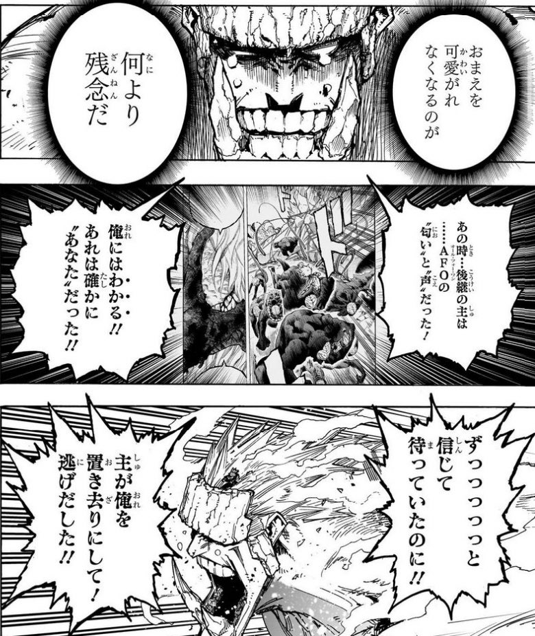 「マキアなら一旦見捨てても後で回収すれば僕のために命を懸けるだろう」ってAFOも他のヒーローも読者も考えてたけど実際は「何十年も自分を大事に想ってくれてると信じて尽くしたのに見捨てられたから山投げつけるぐらいキレてる」だったからな……