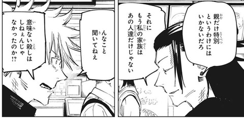 所謂”家族”ではなくて、ファミリー(マフィア)みたいなそんな感じのアレって印象。仲間意識はあるけど、ドン(夏油)が死んだら仲間割れするよね。
