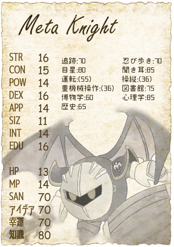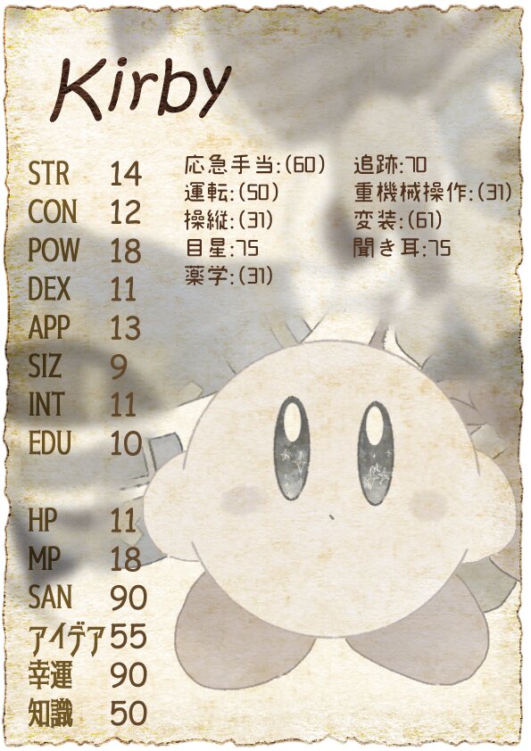 ☆影にひなたにサポーター。同行中、カービィ・デデデ大王はファンブルを出しても通常の失敗として扱う。応急手当・精神分析に+20のボーナス。