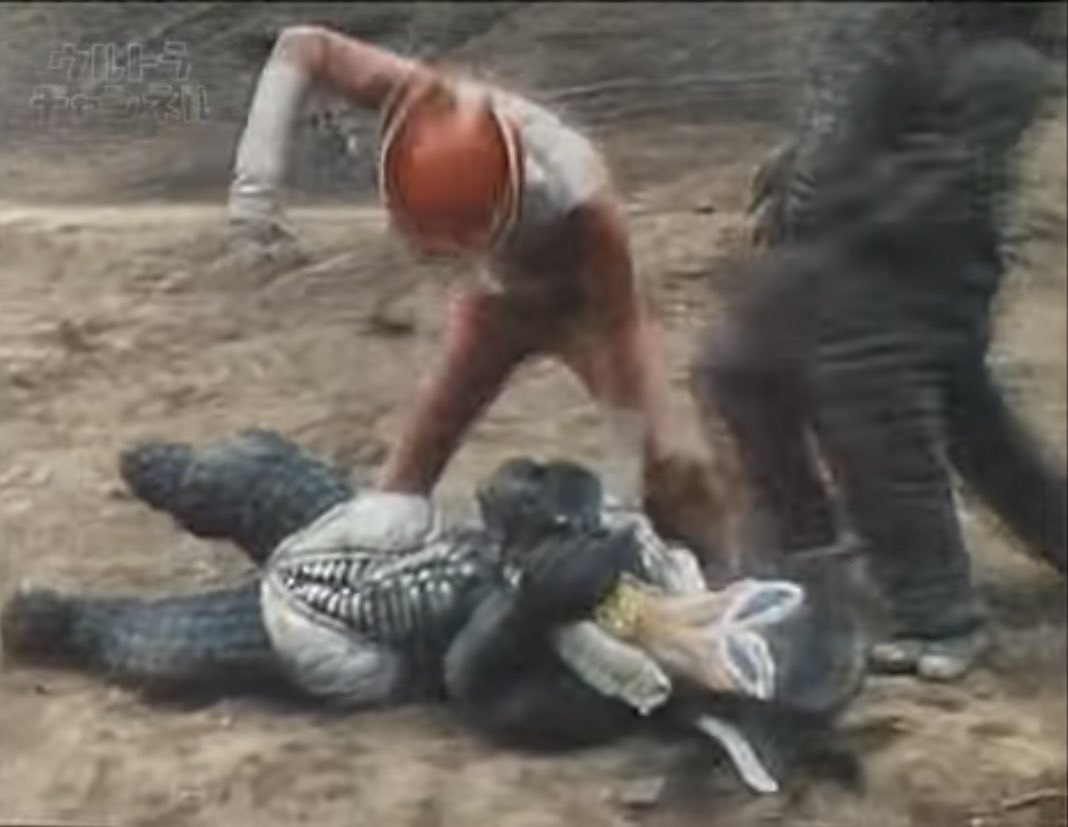 その一撃は白い結晶に覆われた怪獣ギラルスの顔面を正確にとらえ、ひときわ大きな結晶角を叩き折る威力を見せる。