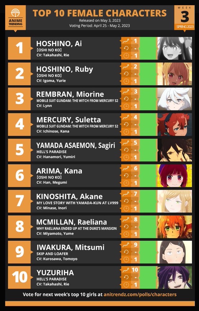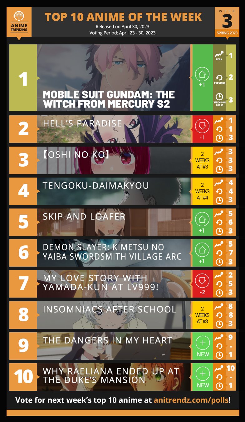Guel's return seemingly propels <a href="https://twitter.com/hashtag/G_Witch" target="_blank">#G_Witch</a> into this week's top spot, dethroning Hell's Paradise! The Dangers in My Heart and <a href="https://twitter.com/hashtag/Raeliana" target="_blank">#Raeliana</a> enters Top 10 for the first time.