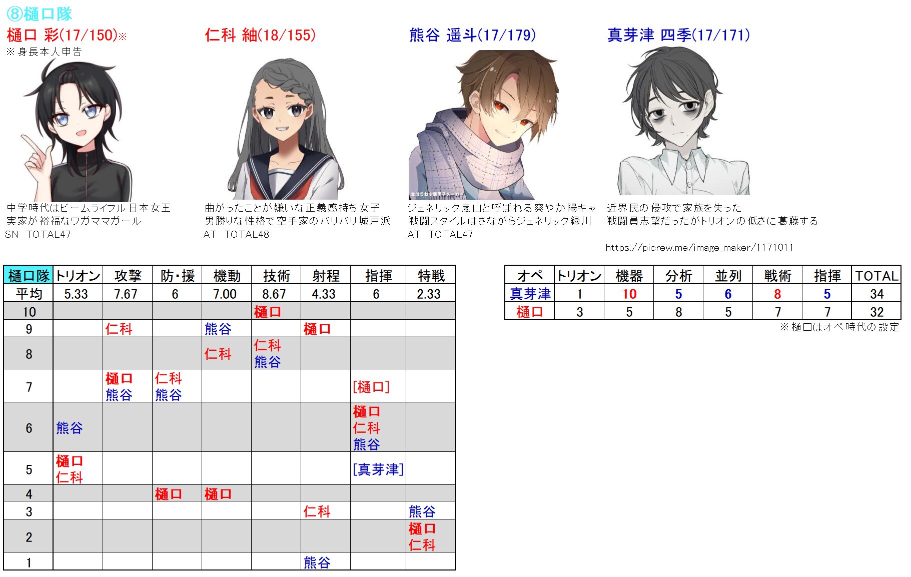 パラメーター一覧telegra.ph>>103で上がってる原作キャラと比べやすいように戦闘員は9以上(指揮は隊長クラスの5以上)オペレーター8以上で色分けしています