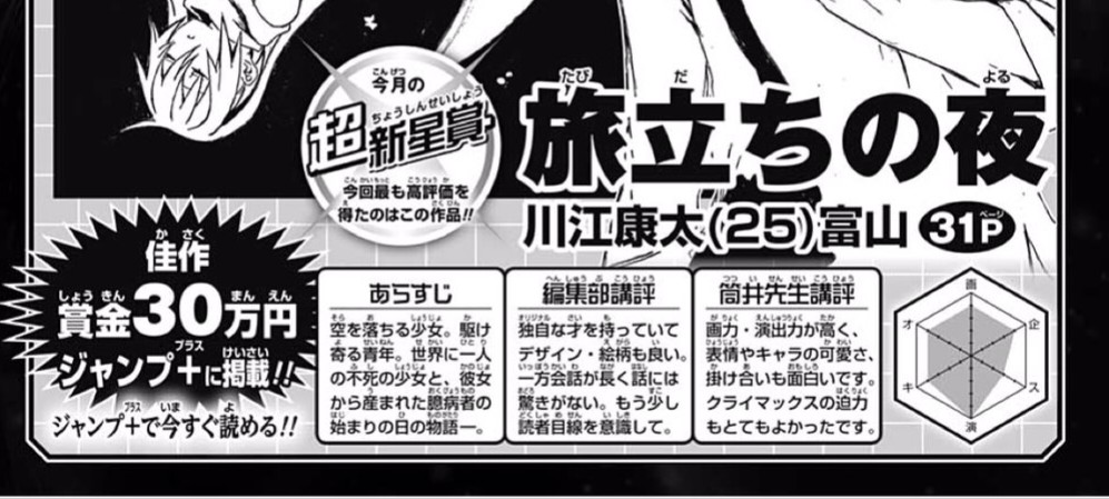 旅立ちの夜/2019年4月期JUMP新世界漫画賞 - 川江康太 | 少年ジャンプ+第25回4月期新世界漫画賞佳作&超新星賞受賞作品!釘付け間違いなし!!不死身の少女を巡る笑えて熱いダークファンタジー!!shonenjumpplus.comジャンプアーカイブ