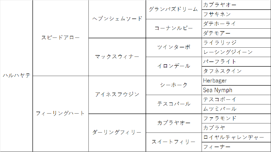 ハルハヤテ、馬名が31ある五代血統表のうち、20が逃げ馬なのな