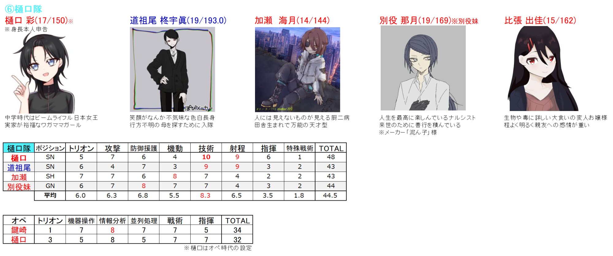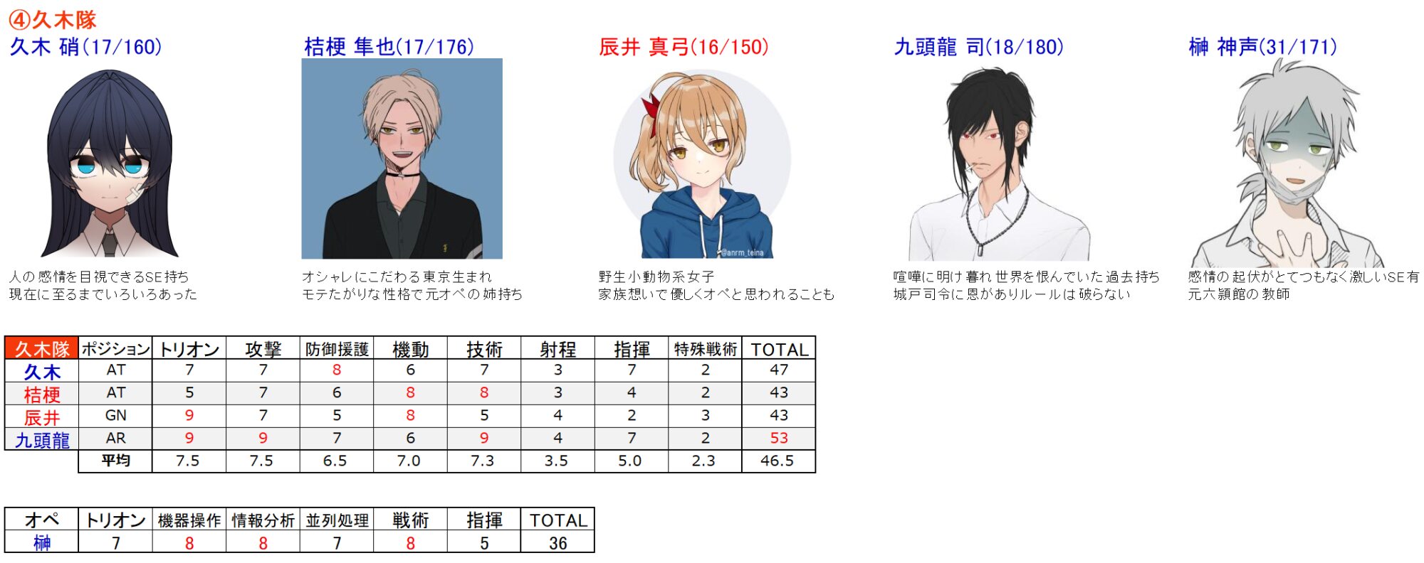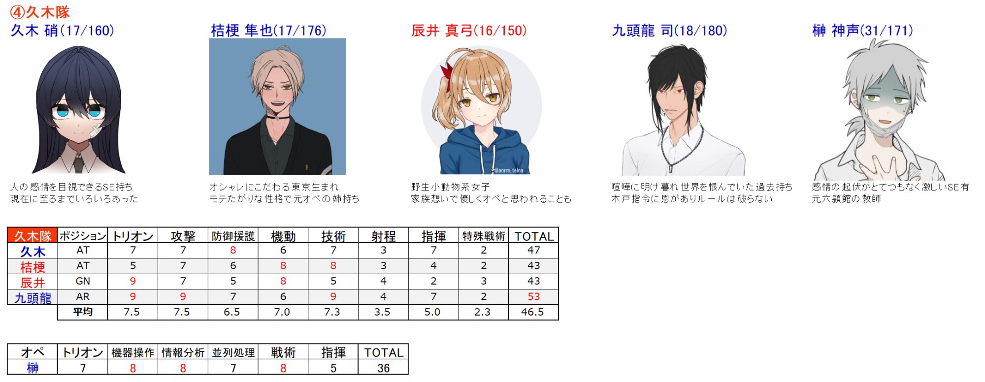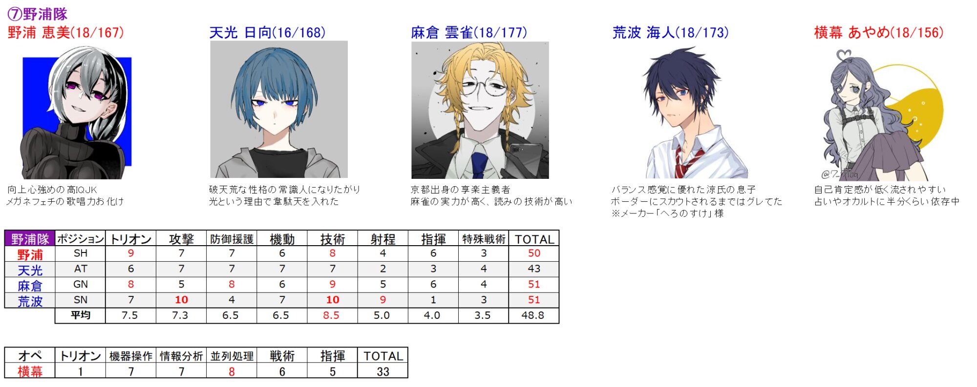 ・戦闘スタイル、好み傾向、モテ度、生身の運動能力、成績は後からでも可(今月末目途にだしてください)