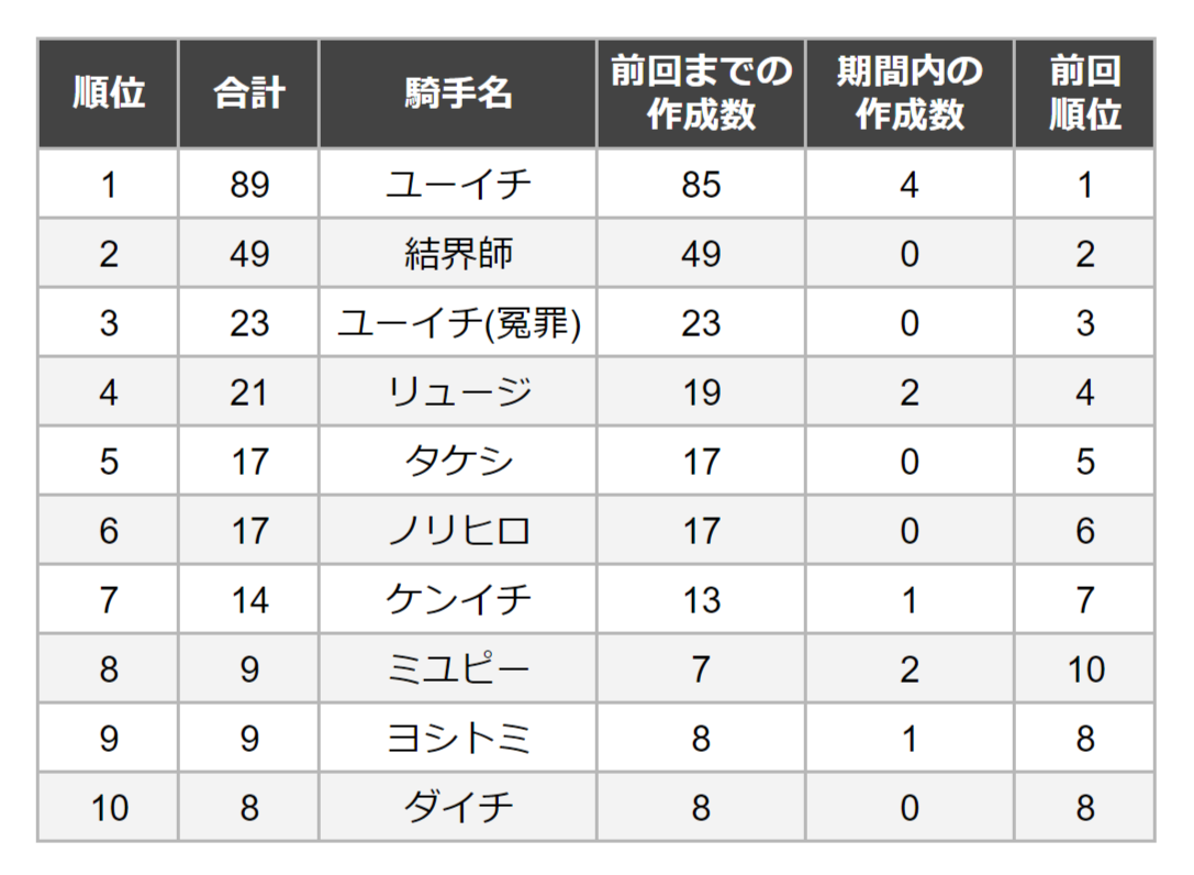 ユーイチ→特異点の原点にしてロード福永二世にして異聞帯の王(ORTかもしれない)。時計塔の核弾頭であり、彼の解析魔術はKGOの封印指定レベルの魔術師たちが野放しな主原因でもある。よく考えると彼も大概ジョーカー。普段はオンラインサロンでやっているG1の振り返りをインスタライブで行い、ケンイチやルメールなど参戦ジョッキー含むたくさんの人が視聴した。ちなみにリュウセイの特番の放送時間に重ねて開いてしまったうっかりさん。遠坂族か?