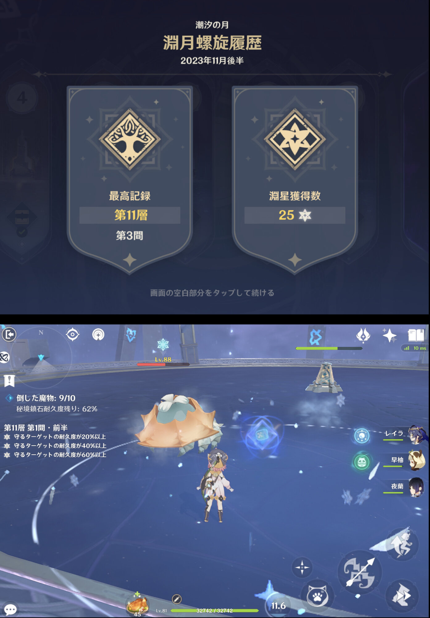 更新螺旋の様子を見ながら11層1間まで! イノシシにやられて星2クリア…!
