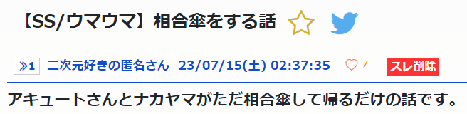 【SS/ウマウマ】相合傘をする話|あにまん掲示板アキュートさんとナカヤマがただ相合傘して帰るだけの話です。bbs.animanch.com - 574期第16回◆mJe.3mFFVE23/07/15(土) 21:49:38