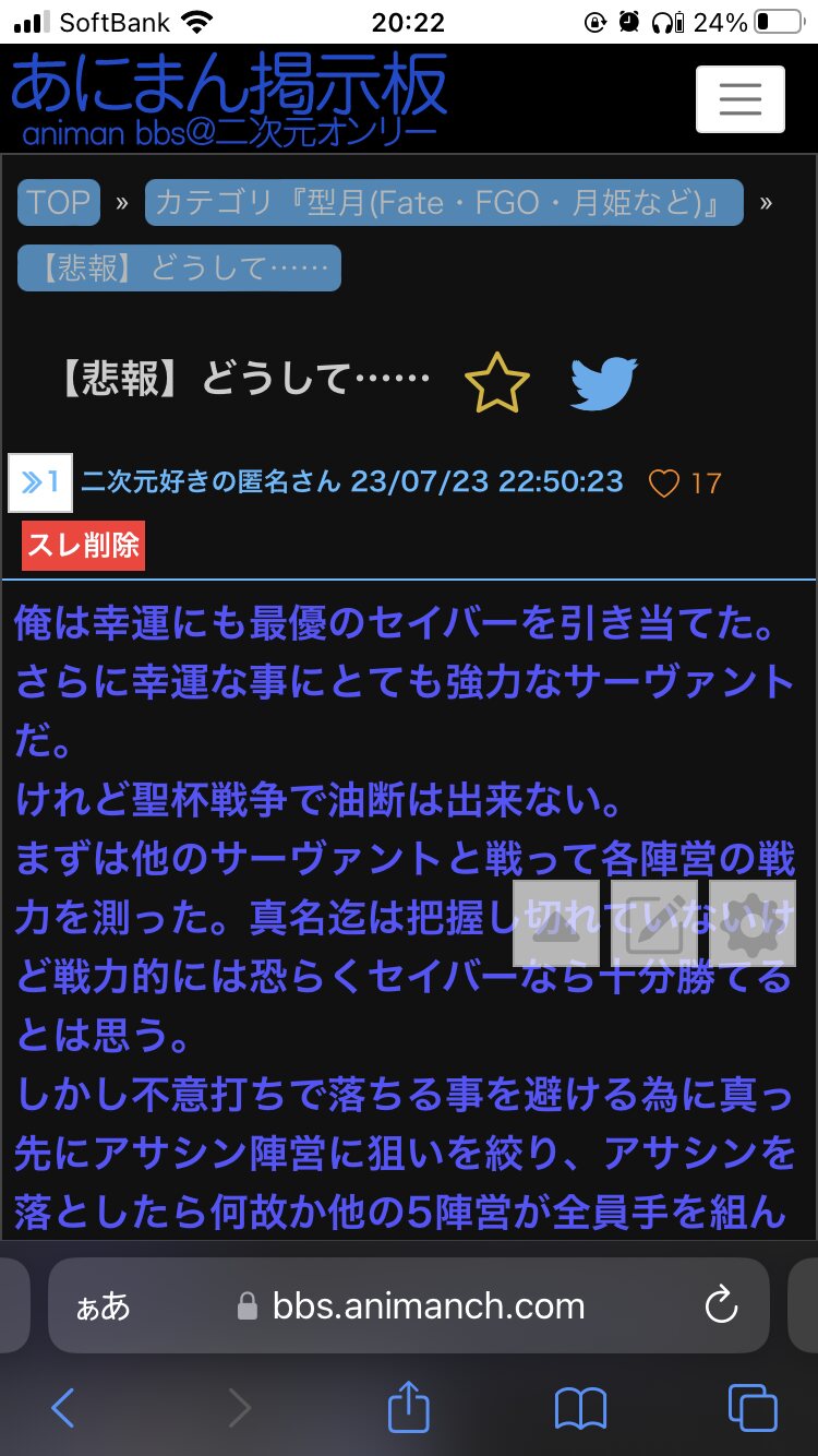 【悲報】どうして……|あにまん掲示板俺は幸運にも最優のセイバーを引き当てた。さらに幸運な事にとても強力なサーヴァントだ。けれど聖杯戦争で油断は出来ない。まずは他のサーヴァントと戦って各陣営の戦力を測った。真名迄は把握し切れていないけど戦…bbs.animanch.com - 2二次元好きの匿名さん23/07/28(金) 20:21:58