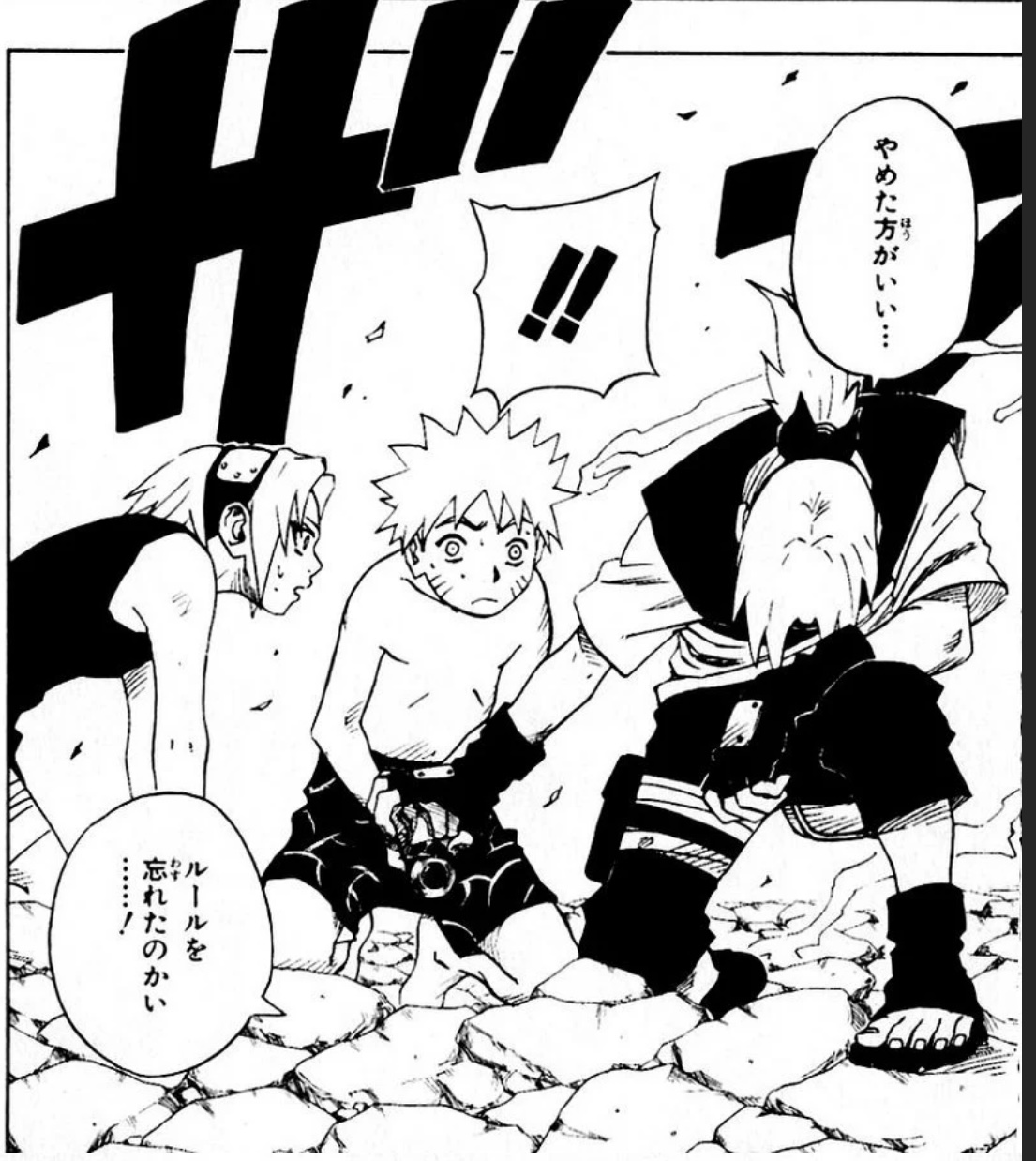というか、特に何の事前説明もなく急に目の前に知らん忍が出てきたら普通は攻撃態勢になるから、本来は下忍に返り討ちにされるような中忍が悪い ってところなんだけど、あまりにも相手が悪いのでそれを言うのも可哀想ではある・・・