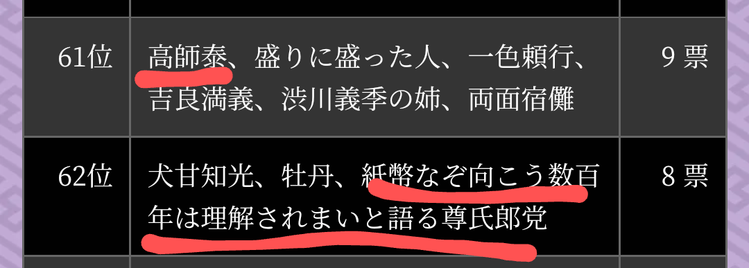 人気投票結果どうなる?って話題の時に尊氏一位!って吹かしてる奴には「いやインターミッション前だからそんなに票入らないだろ」「普通に若と頼重に票集まると思う」って意見出てたけどな