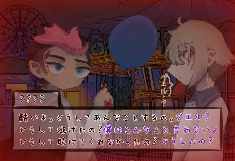 エランは不意に疑問に思って、少しだけ顔を顰めた。なんだかとても嫌な予感がする。あまりこのふうせんを受け取らない方がいいような__この風船は『何』だ?一歩後ずさると、スレッタがシャディクに何かを渡しているのが見えた。