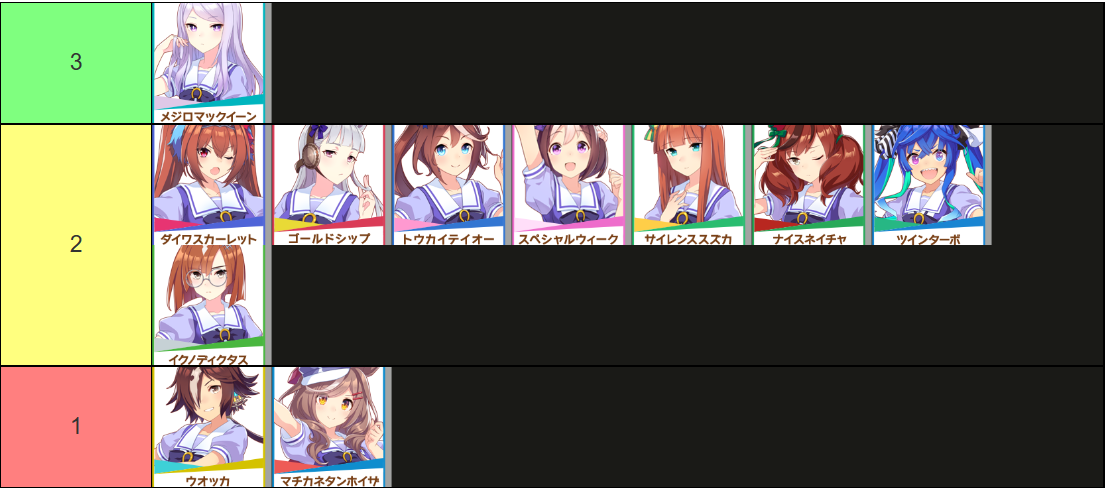 「全員は分類できないが、解釈によっては分類可能なキャラもいる」と書きましたが、正確にはこの表に載る「ウマ娘は」現状全員載ってます