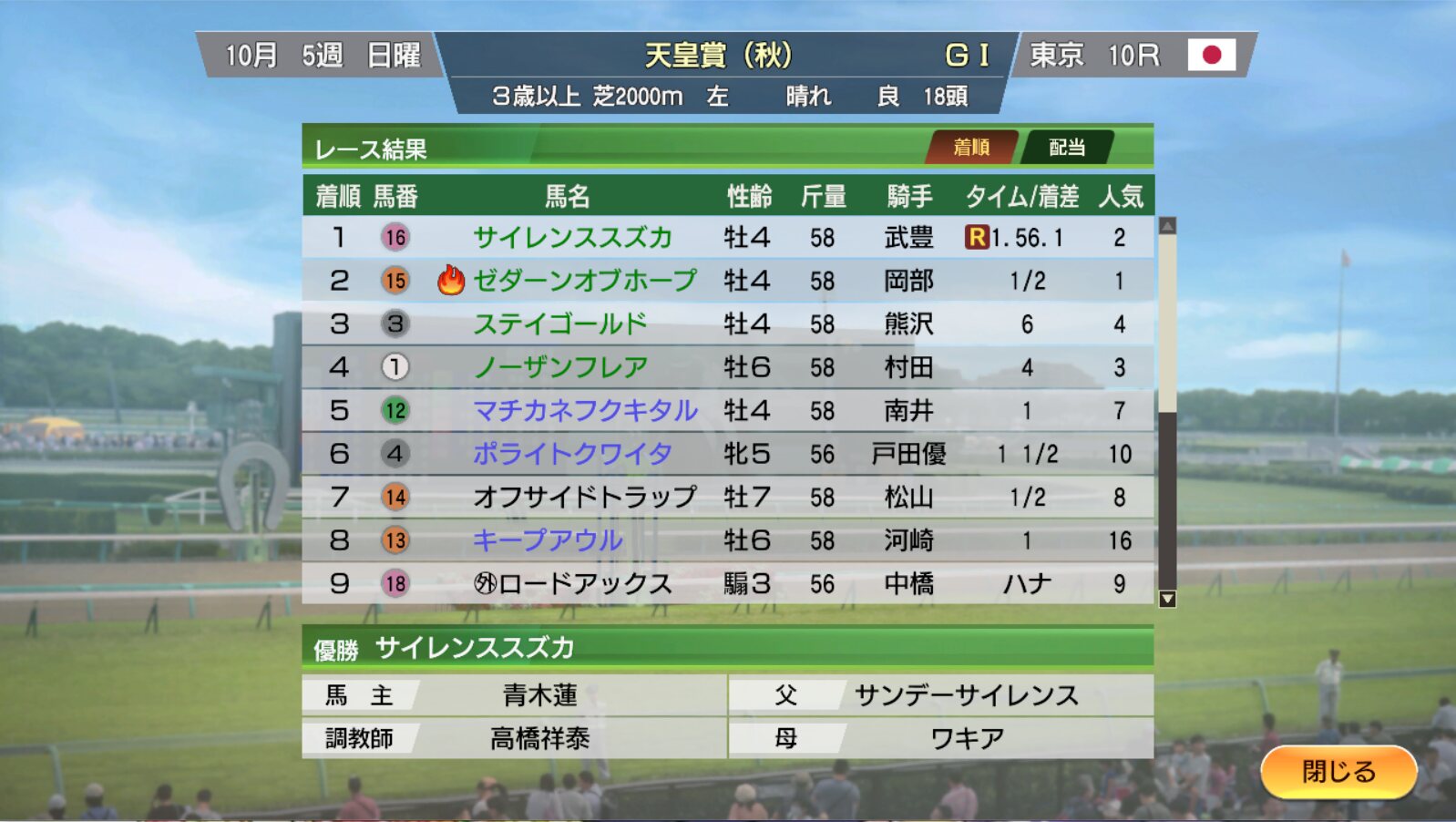 もちろん史実より軽いローテで繁殖入りまで無事に走らせたんだけど、マヤノトップガン付けたら王道路線蹂躙のヤバい覚醒馬が出てきてびっくりしたことあるわ
